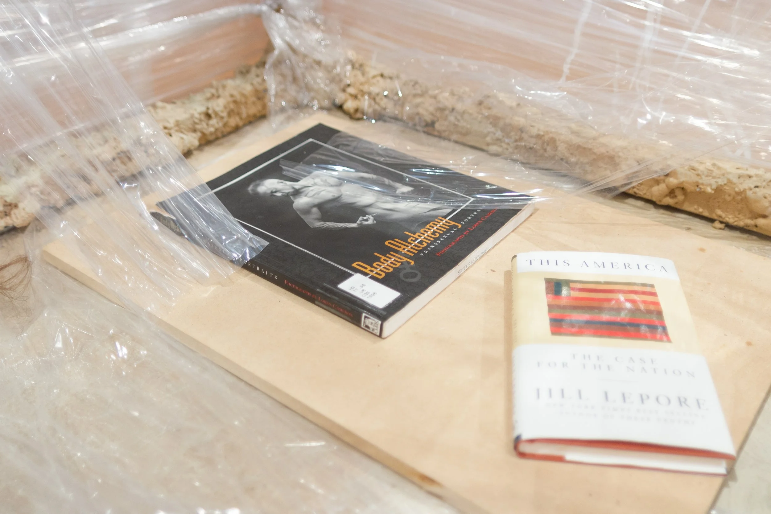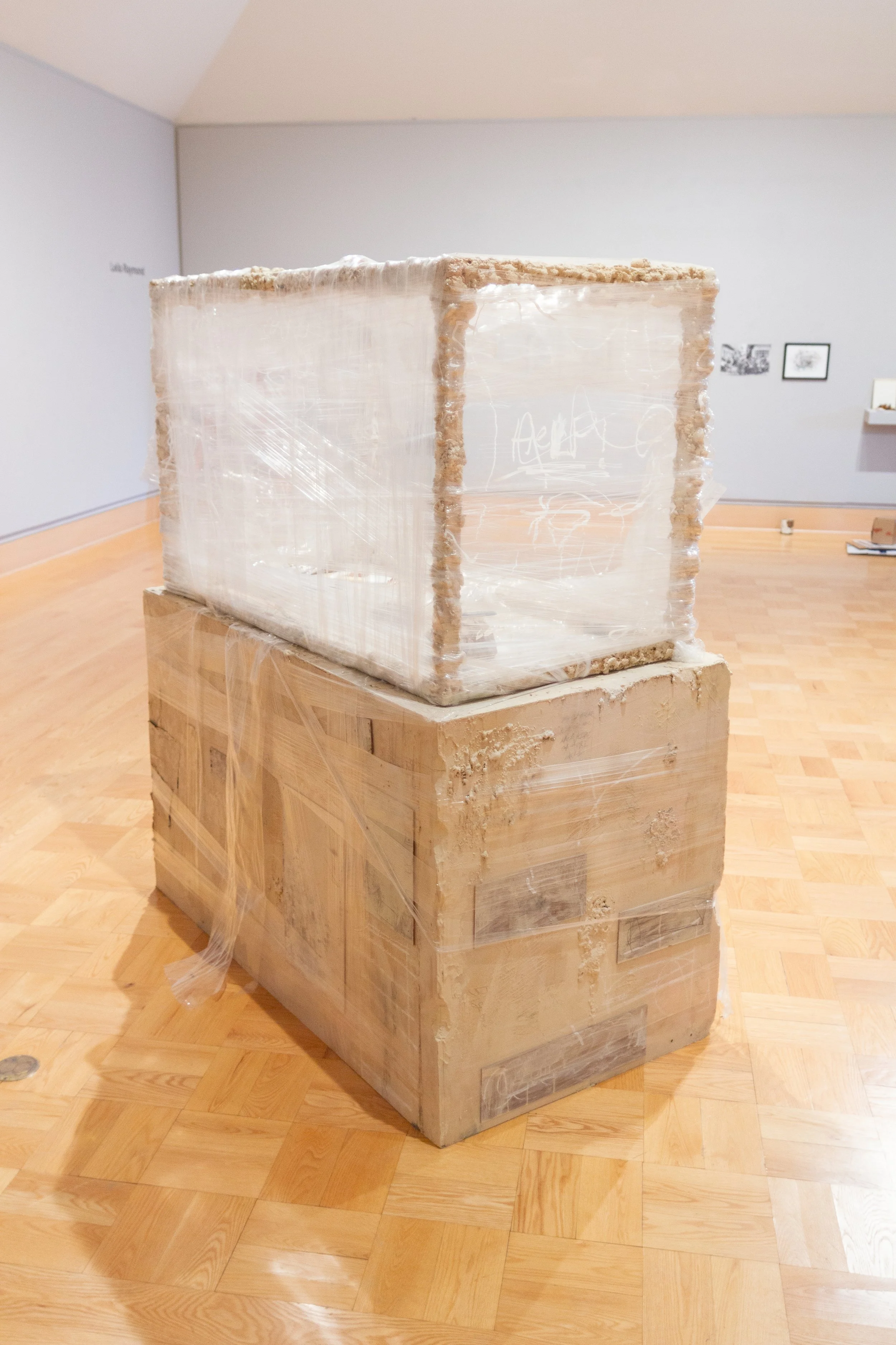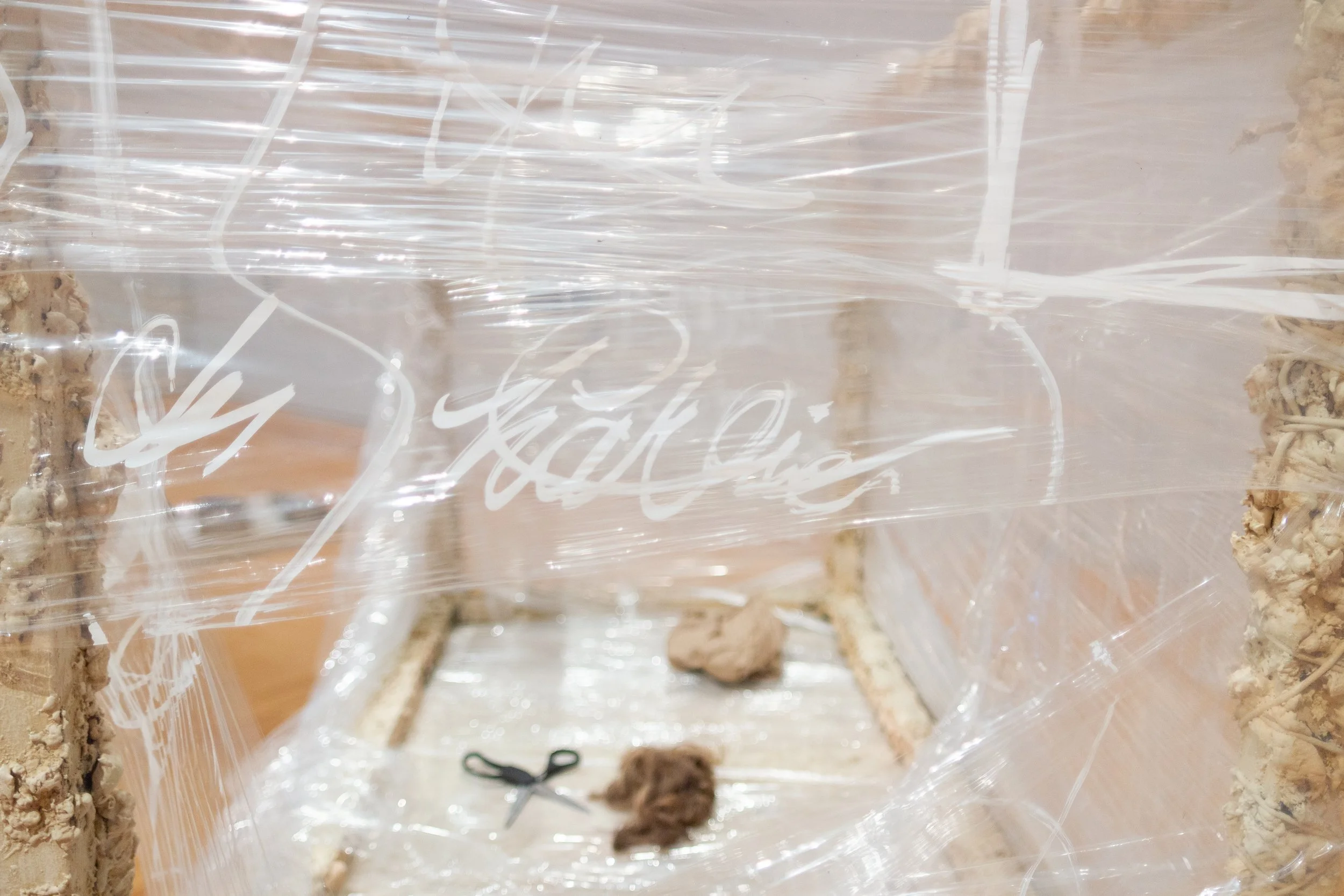 This is documentation from a one-hour durational performance where I complete mundane tasks—such as administering my estrogen injection, calling my doctor, and eating a meal—inside of an enclosure made from shrink-wrap, steal, MDF, and foam. My artistic practice centers around my changing, transexual body, and my work blurs the line between body and art. With everything I make, I explore trans ontology through raw imagery, humor, and a skepticism about the value of subtlety. Untitled was made in conversation with works by artists like Felix Gonzalez-Torres, Cassils, and Doreen Garner, and it explores—and makes fun of—the commodification of queer bodies.