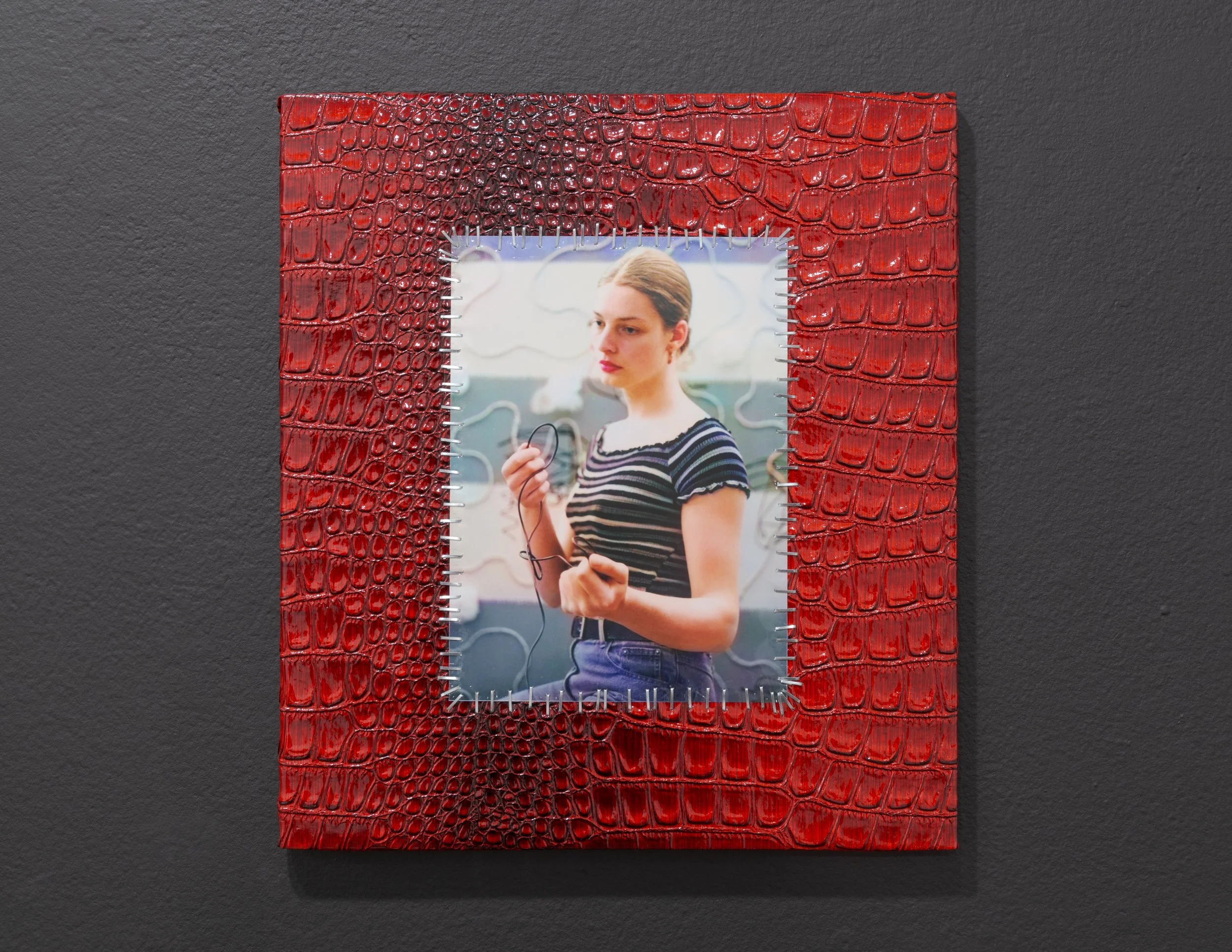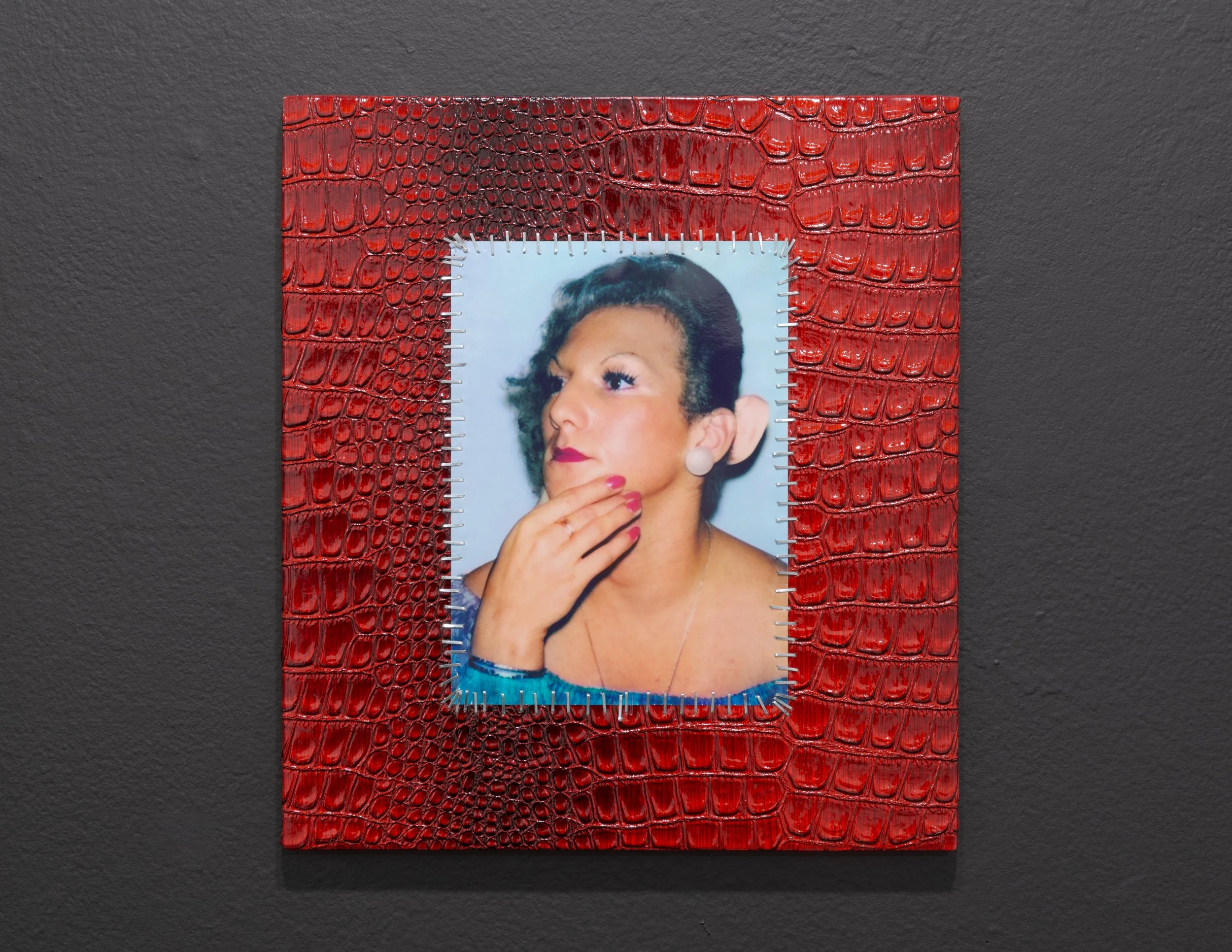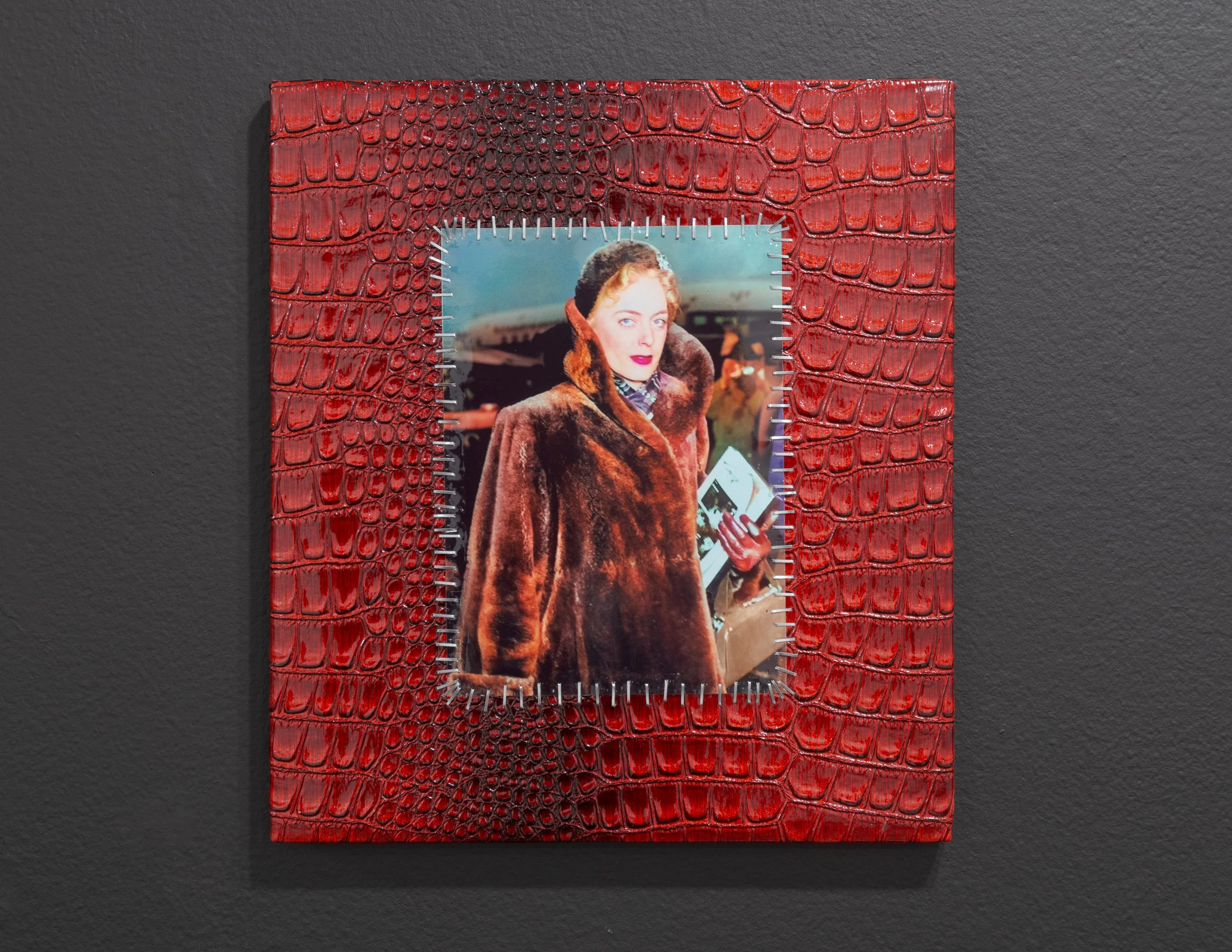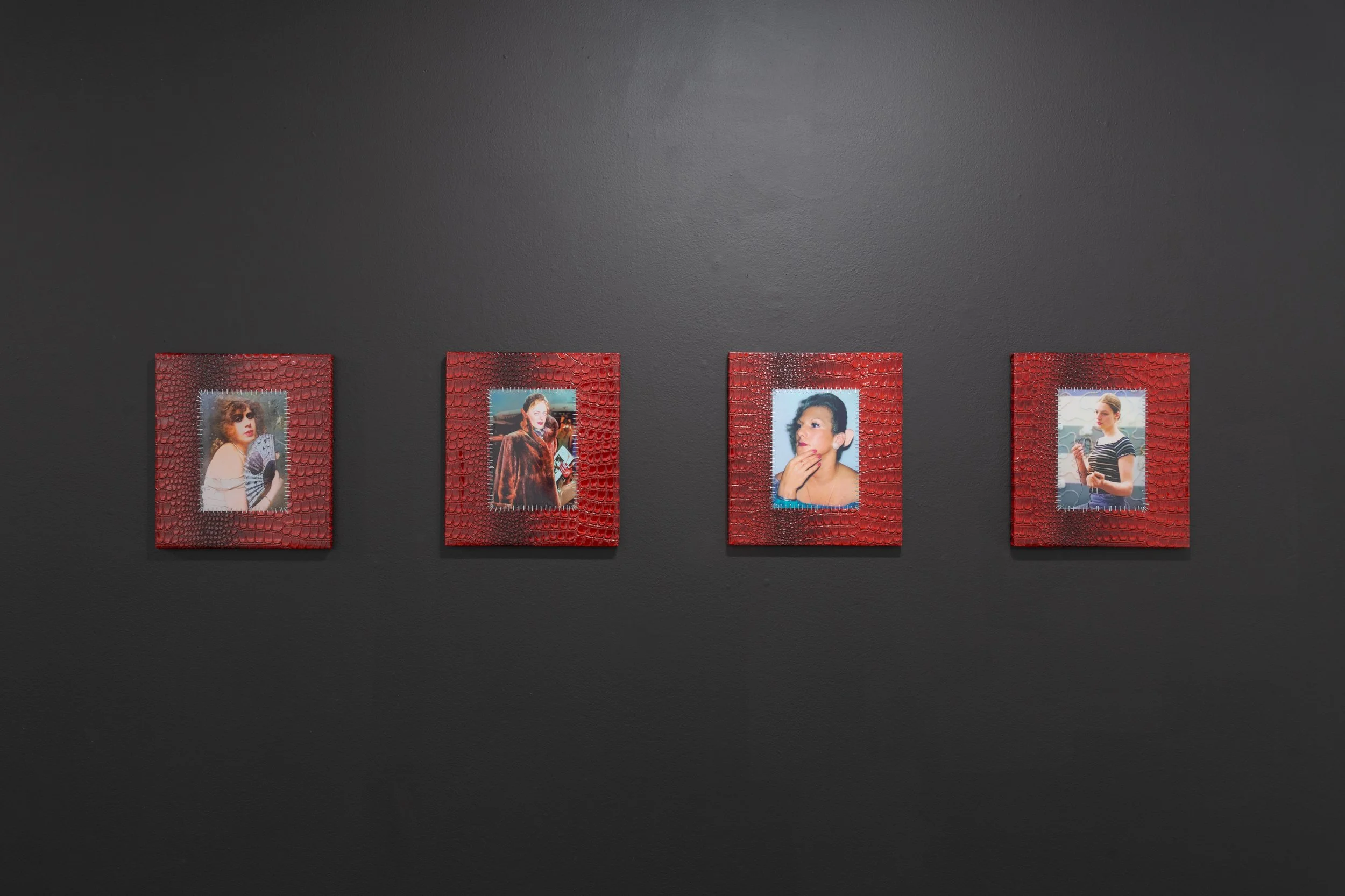 This series of digital chromogenic prints is made up of colorized black and white photographs of transgender women mounted to faux-snakeskin with metal staples. The first three in the series depict elders–trans women who came before me–and the final image is a self portrait. From top left to bottom right, they are titled, Portrait of Grandma Elbe, Portrait of Mother Christine, Portrait of Sister Lurdes, and Portrait of Daughter Charlie.