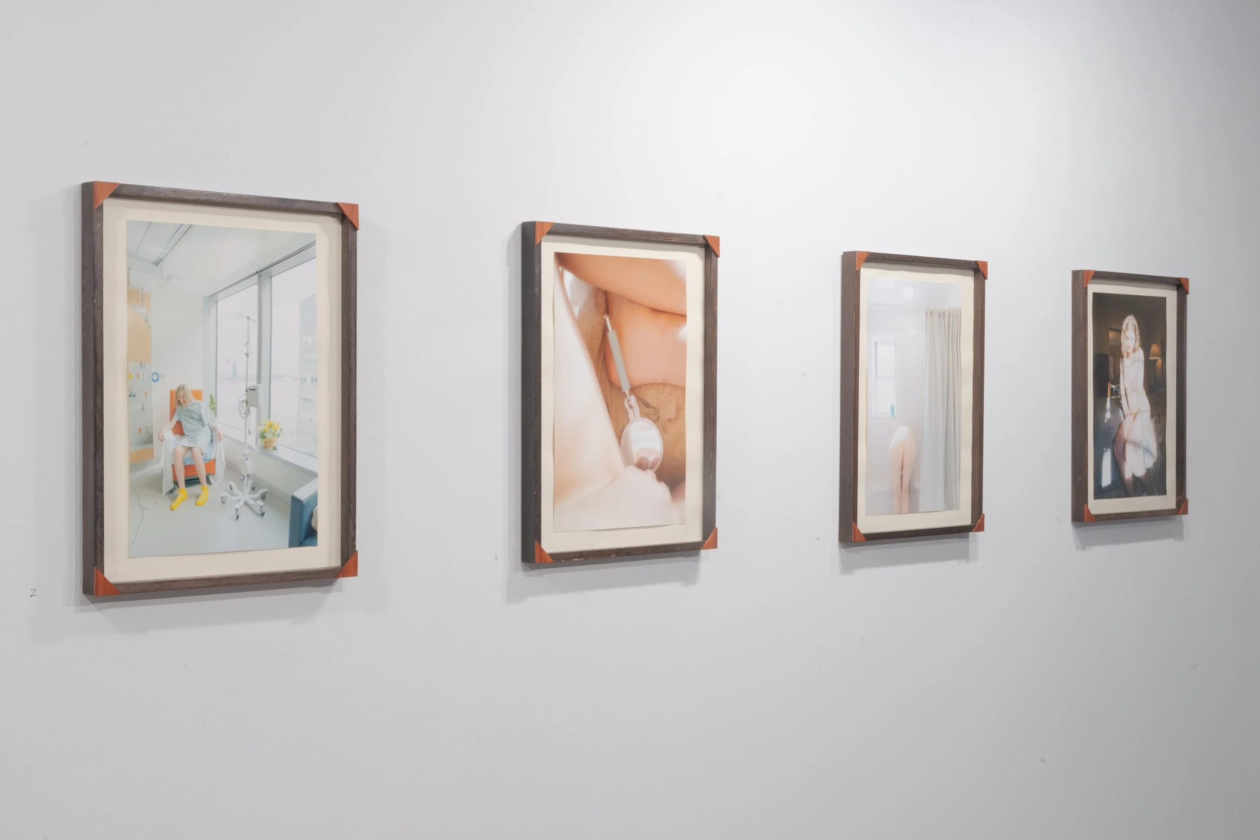 I made Self Portraits One Through Four—Self Portrait with Flowers and Catheter Bag, Self Portrait Through Mirror with Blemish, Self Portrait in Shower, and Self Portrait on Bed—during my recovery from gender-affirming vaginoplasty in the spring of 2022. These photographs were shown as part of my undergraduate Honors Thesis, “The Art, Theory, and Practice of Transgender Life.” The frames shown in the center image were made by me out of chemically-ebonized red oak and mahogany.